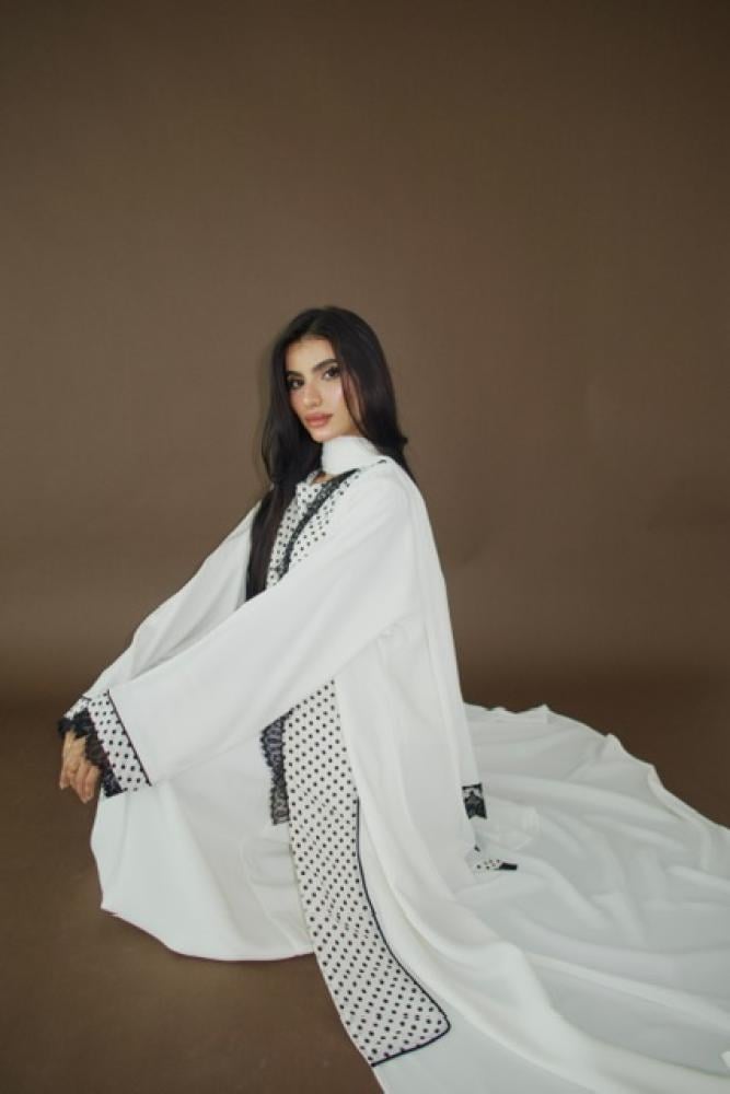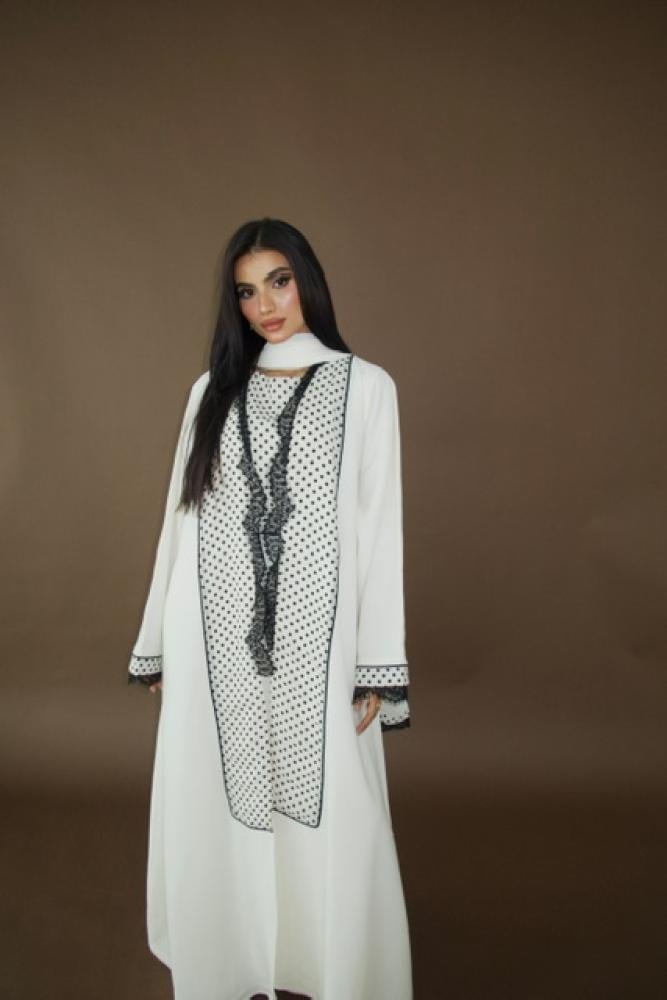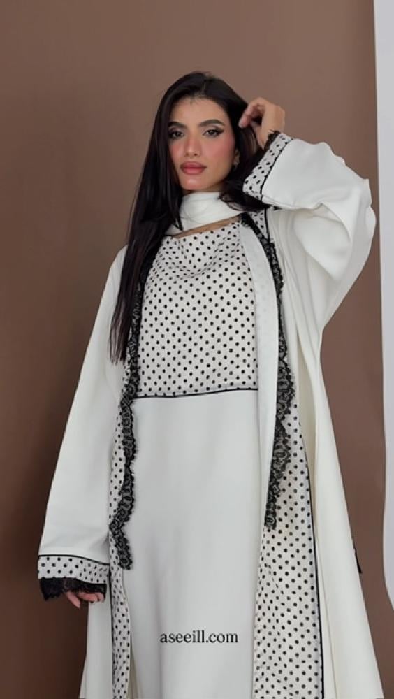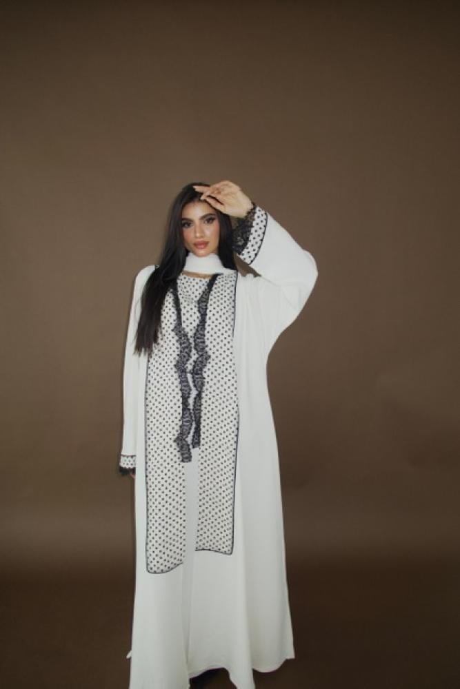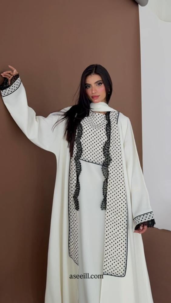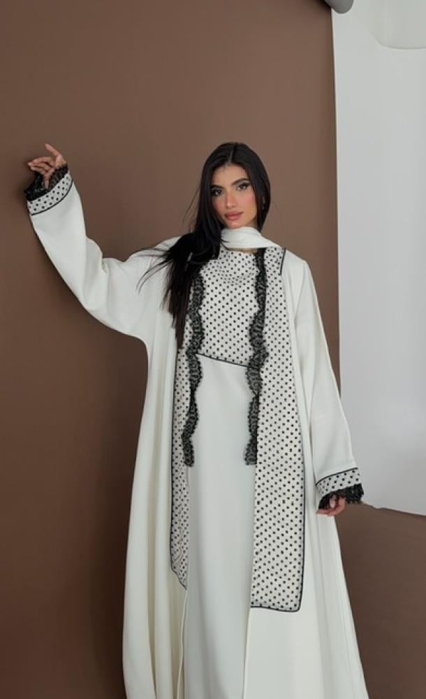 القماش : كريب اوف وايت + منقط اوف وايت + دانتيل