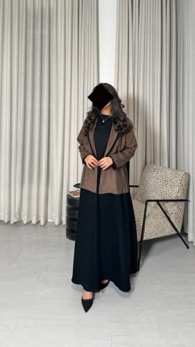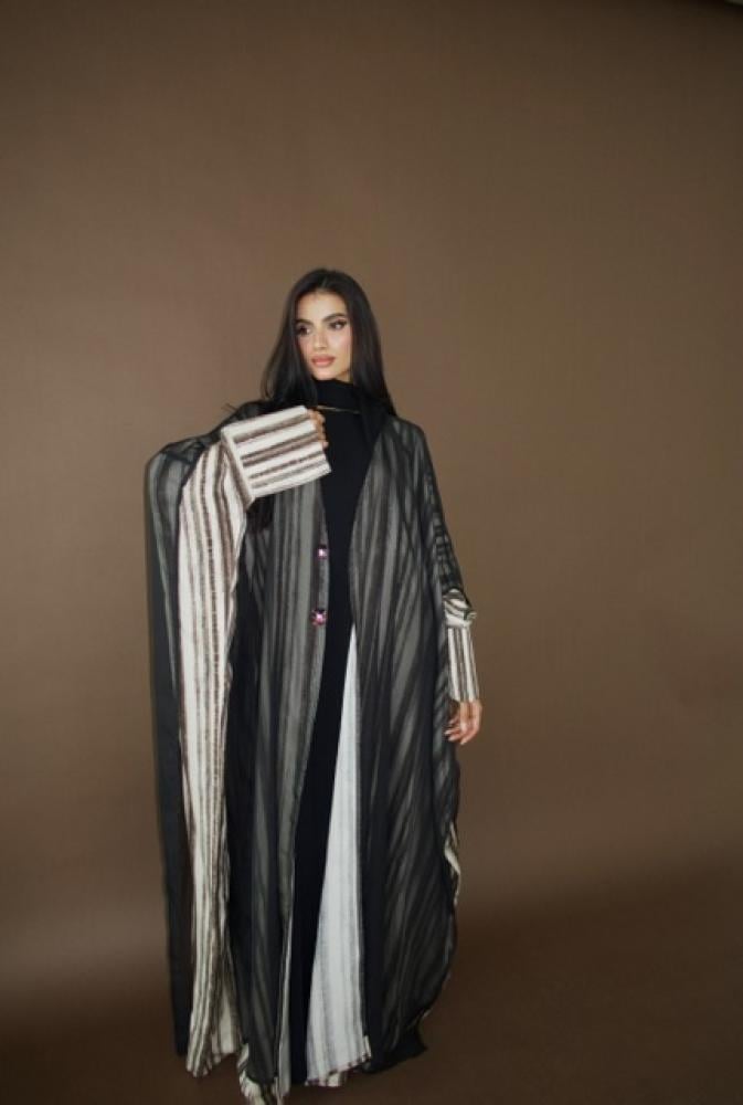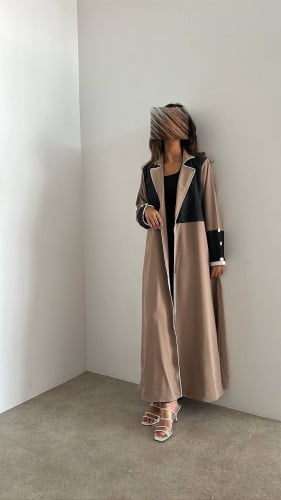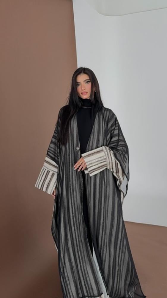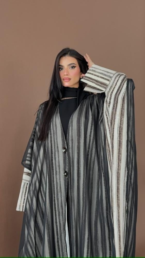 القماش كريب مخطط بني وبيج X شيفون اسود وردتين من الامام بني