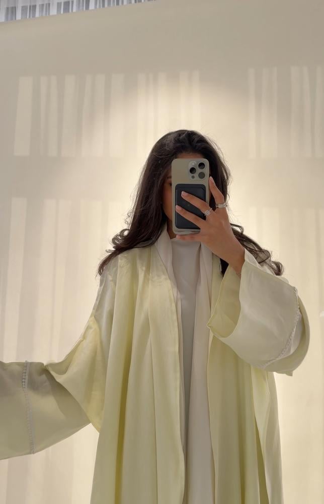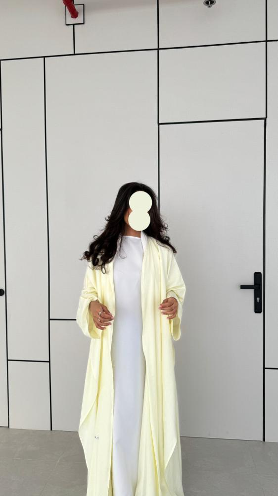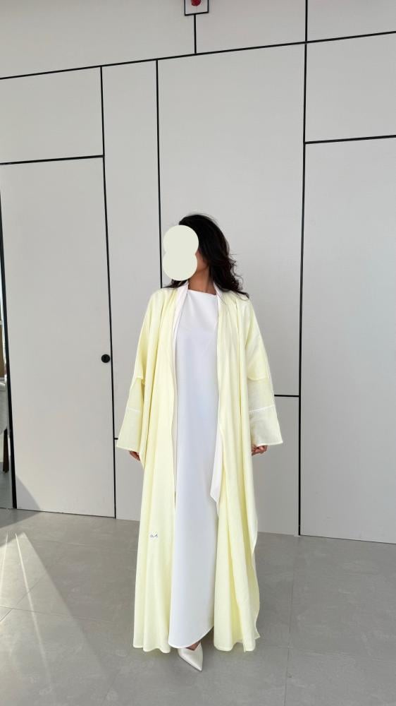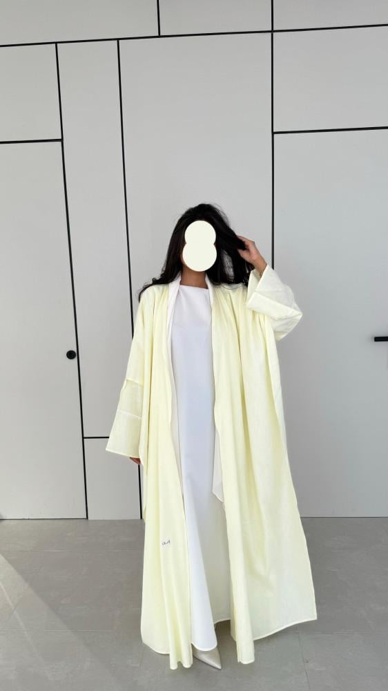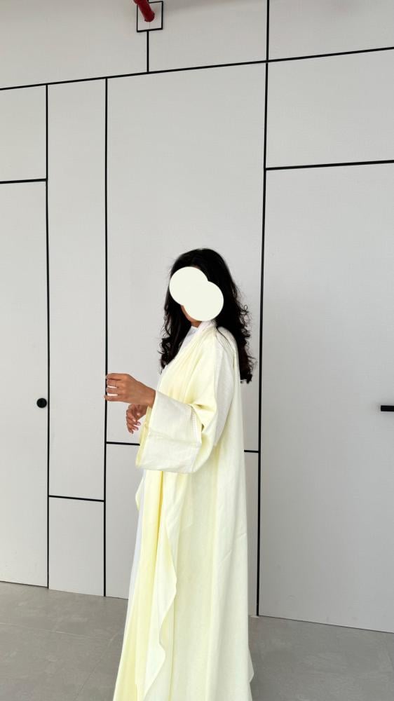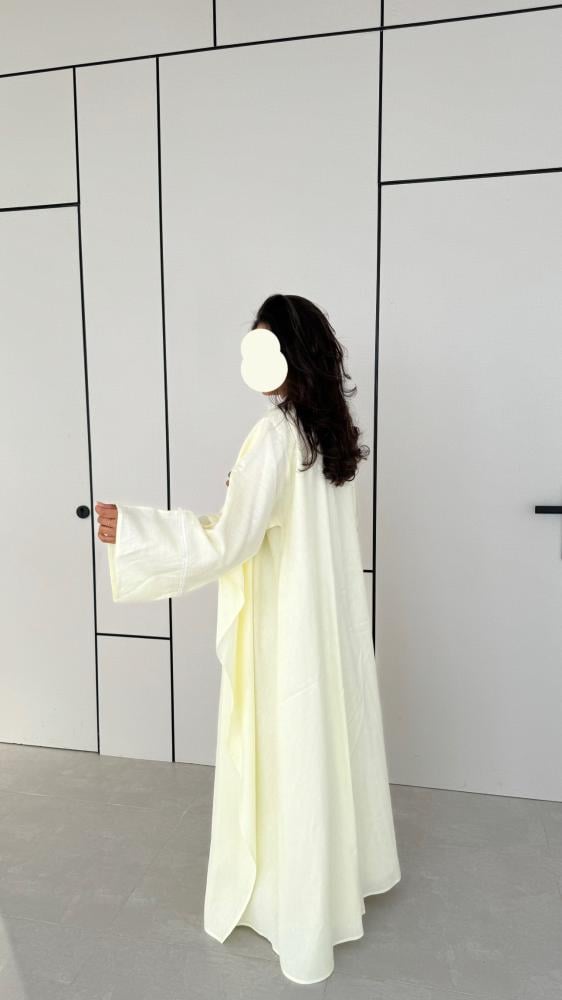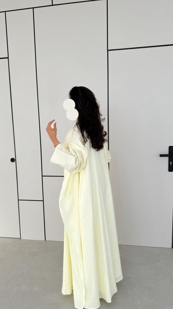 •القماش لينن اصفر فاتح جداً وكلفة بالأكمام