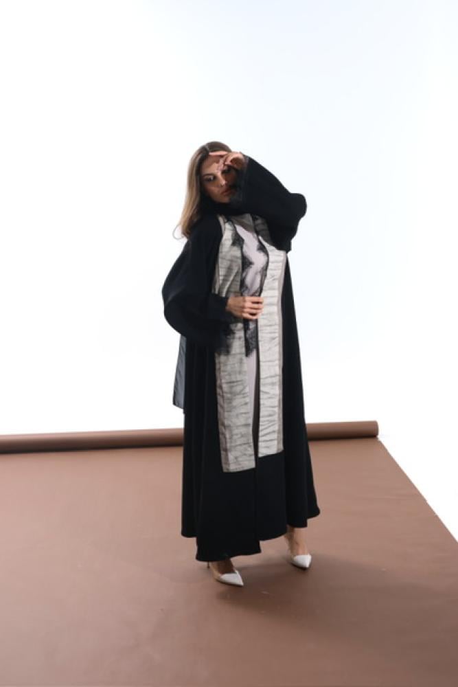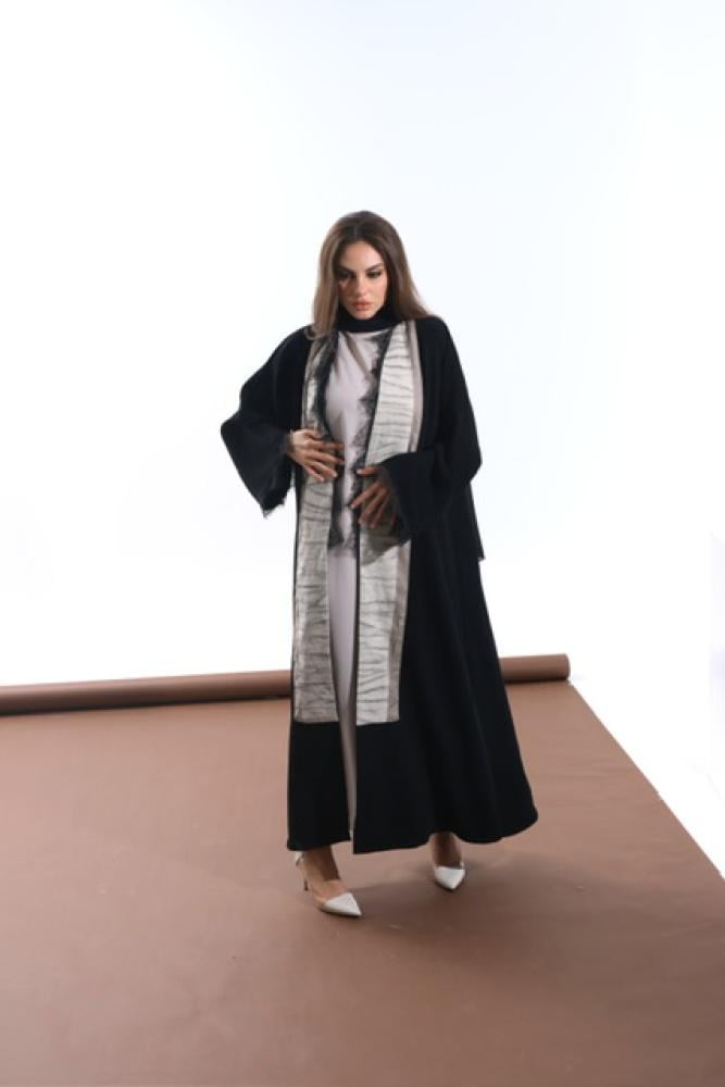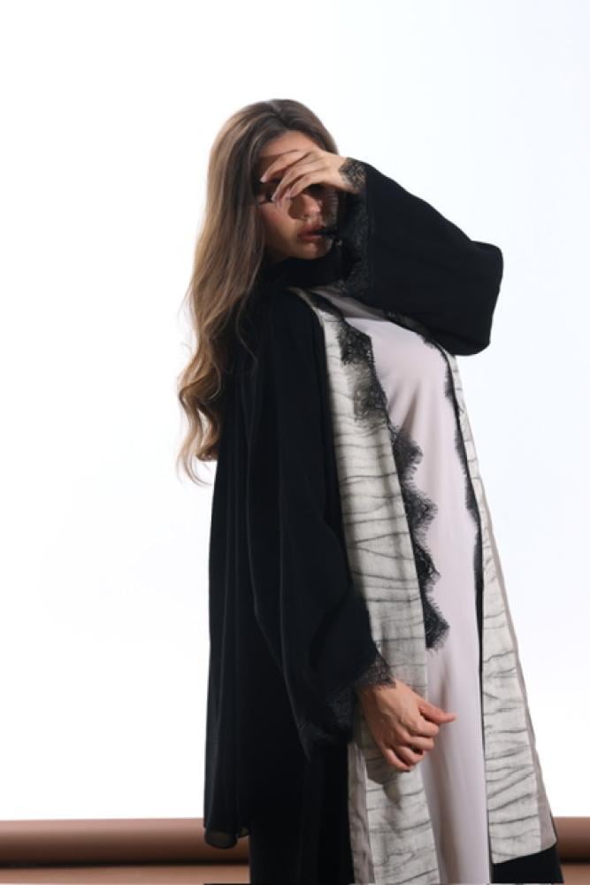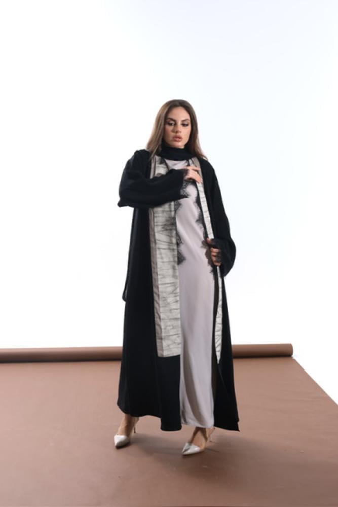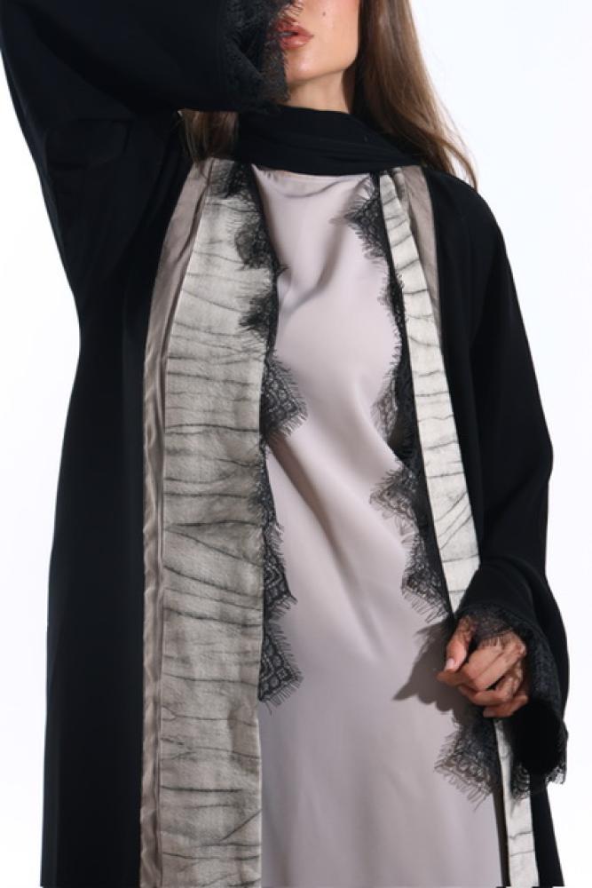 •القماش : كريب مع اضافة قماش مشجر وسادة بيج ودانتيل